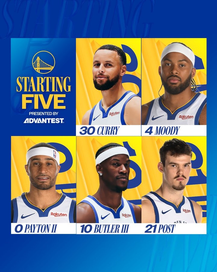 赛前勇士官方公布了本场首发:库里、穆迪、巴特勒、小佩顿、波斯特。