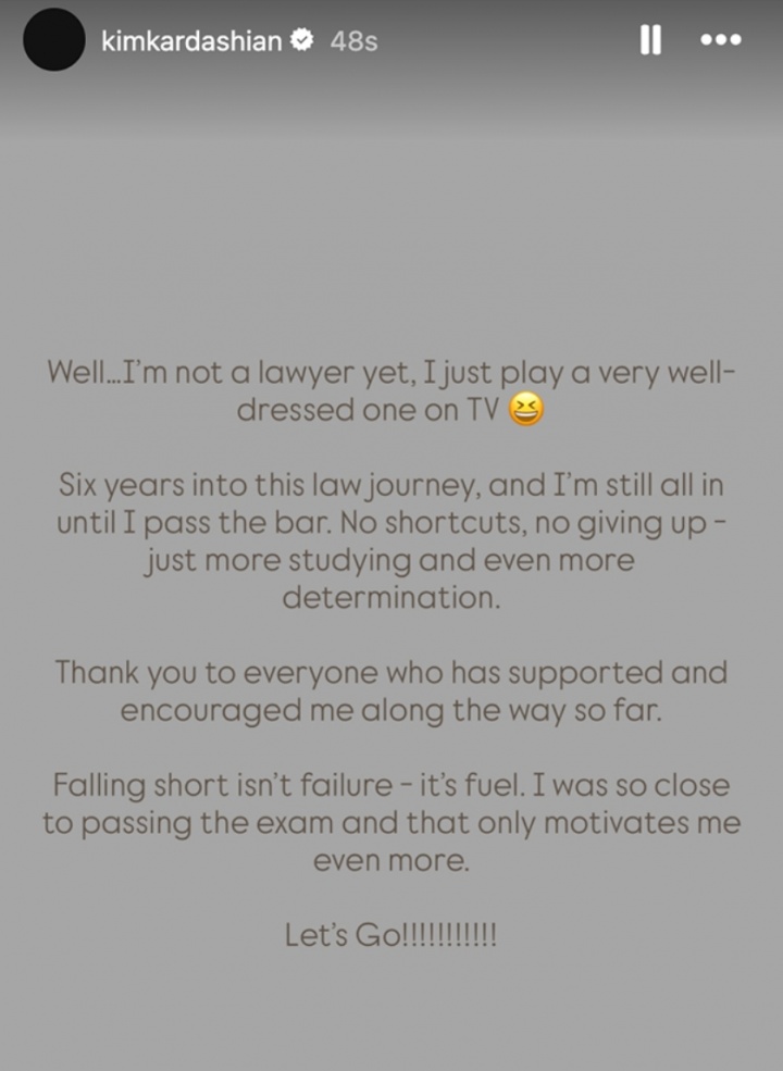 金卡月初发文表示:“我还不是一名律师,我只是在电视上扮演一个穿着考究的律师,六年来我一直在为通过律师资格考试坚持攻读法律学位。不走捷径、不放弃。只会更加努力学习,更加坚定决心。感谢一直以来支持和鼓励我的所有人,失败不是挫折,而是动力。我离通过考试只差一步之遥,这会让我更加努力,加油!”