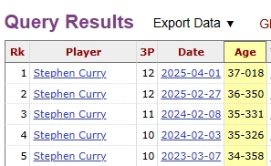 哈登和库里也是NBA历史上仅有的两位36岁后单场至少10记三分+55分的球员(库里36岁350天单场12记三分得到56分)。